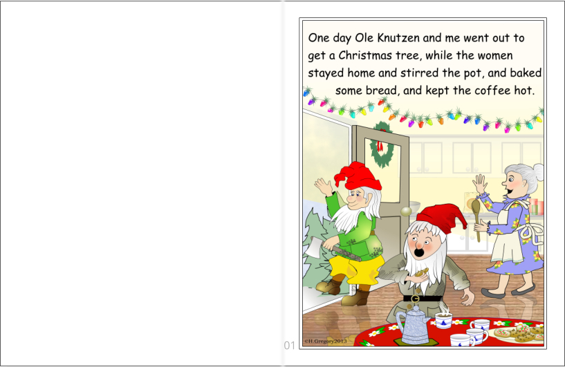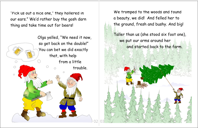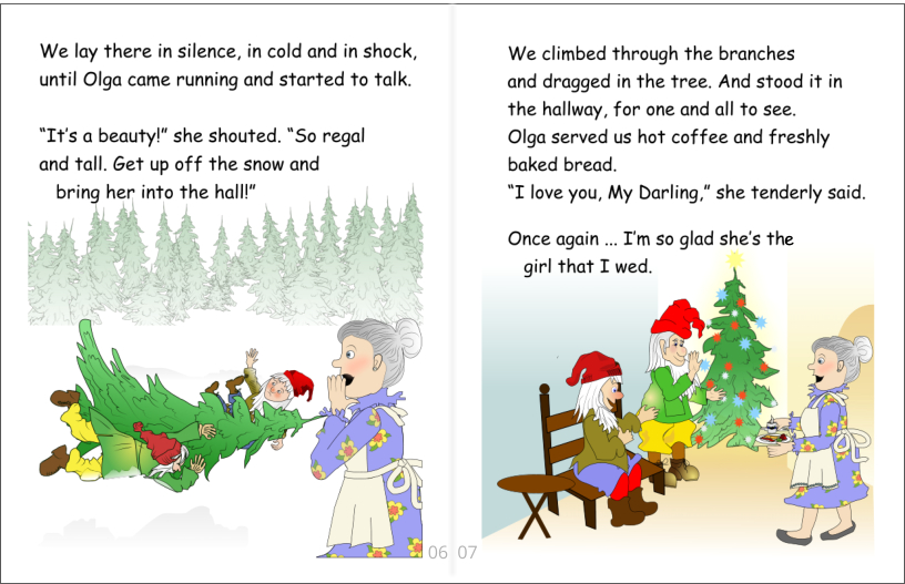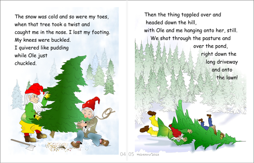 "God Jul!". Yep, scandinavians really enjoy the Christmas holidays! This little rhyming tale is of two hardy Nordic gents harvesting a tree for Christmas. They select a beautiful evergreen, chop it down and start to drag it home when trouble hits!