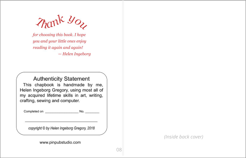 This chapbook is 4¼ x 5½ inches in size, 8 pages plus covers, and is written, illustrated, printed, bound and trimmed by me in my home hobby room. The price is $4.50 USD. Do add $3.50 for USPS delivery tracking & insurance on orders up to $50. See order form Thank you. Scroll down to have a look ... (it's okay to laugh)
