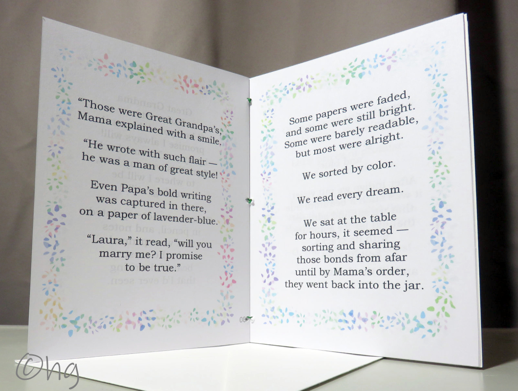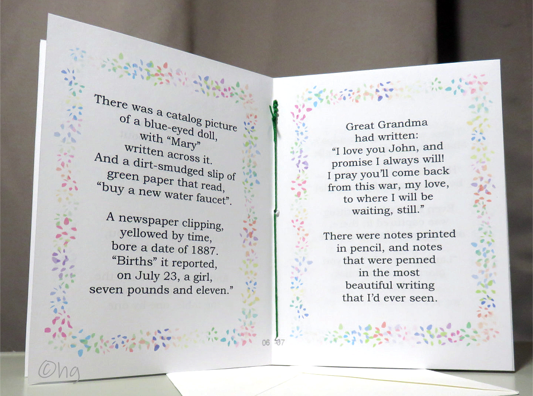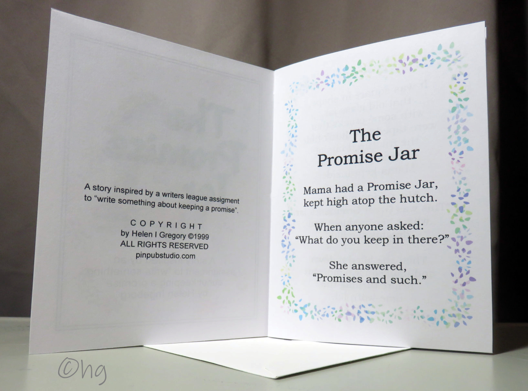 to "write something about keeping a promise". So I did: a mother-daughter conversation over memos from the past. My booklets are created one at a time written, designed, formatted, printed, hand-bound, trimmed, numbered, dated and signed all by me. Size 4¼ x 5½ inches (a Chapbook), 12 pages plus covers, $4.00 (US). Add $3.50 for USPS tracking & insurance. See order form